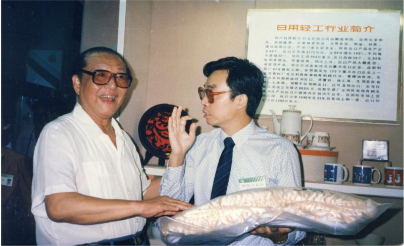 時(shí)任國務(wù)院副總理習(xí)仲勛(左一)親自聽取關(guān)于神農(nóng)藥枕的詳細(xì)匯報(bào),并親切關(guān)懷。