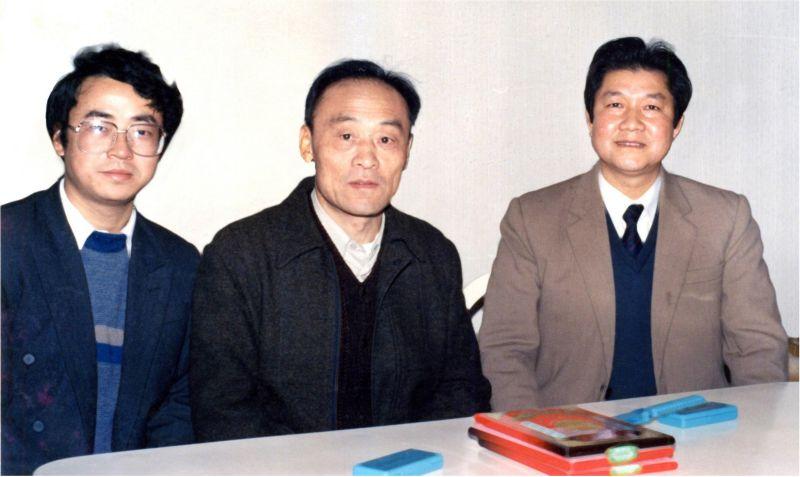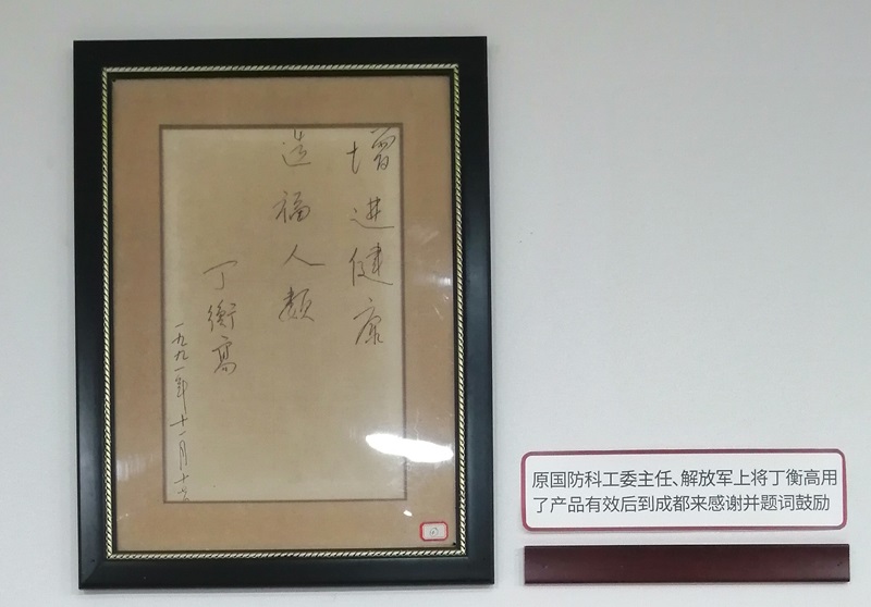 中國科學院院士、解放軍上將、國防科工委主任丁衡高(中)親身體驗公司產品精氣神元氣袋后,接見精氣神元氣袋研制者馬留文博士(右一)和成都市新都保健用品研究所付順剛所長(左一),并題詞予以肯定和鼓勵